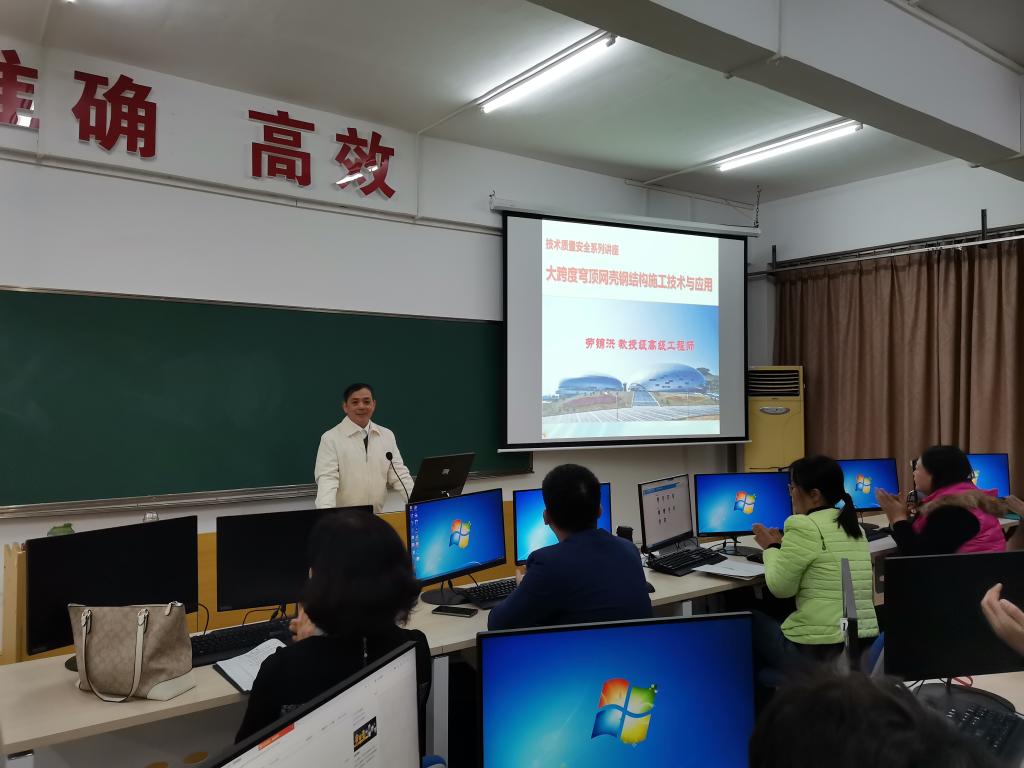 为提升太阳成集团tyc41183师生的科研能力和技术应用水平,12月9日晚7:30,公司教授级高级工程师劳锦洪教授在建工机电楼A207开展了“大跨度穹顶网壳结构高空环向旋转双向累计滑移施工技术与应用”专题讲座,太阳成集团tyc41183经理吴承霞,印宝权、杨树峰、王小艳、蒋艳芳等10多位教师代表及公司50余名员工参加了本次讲座。