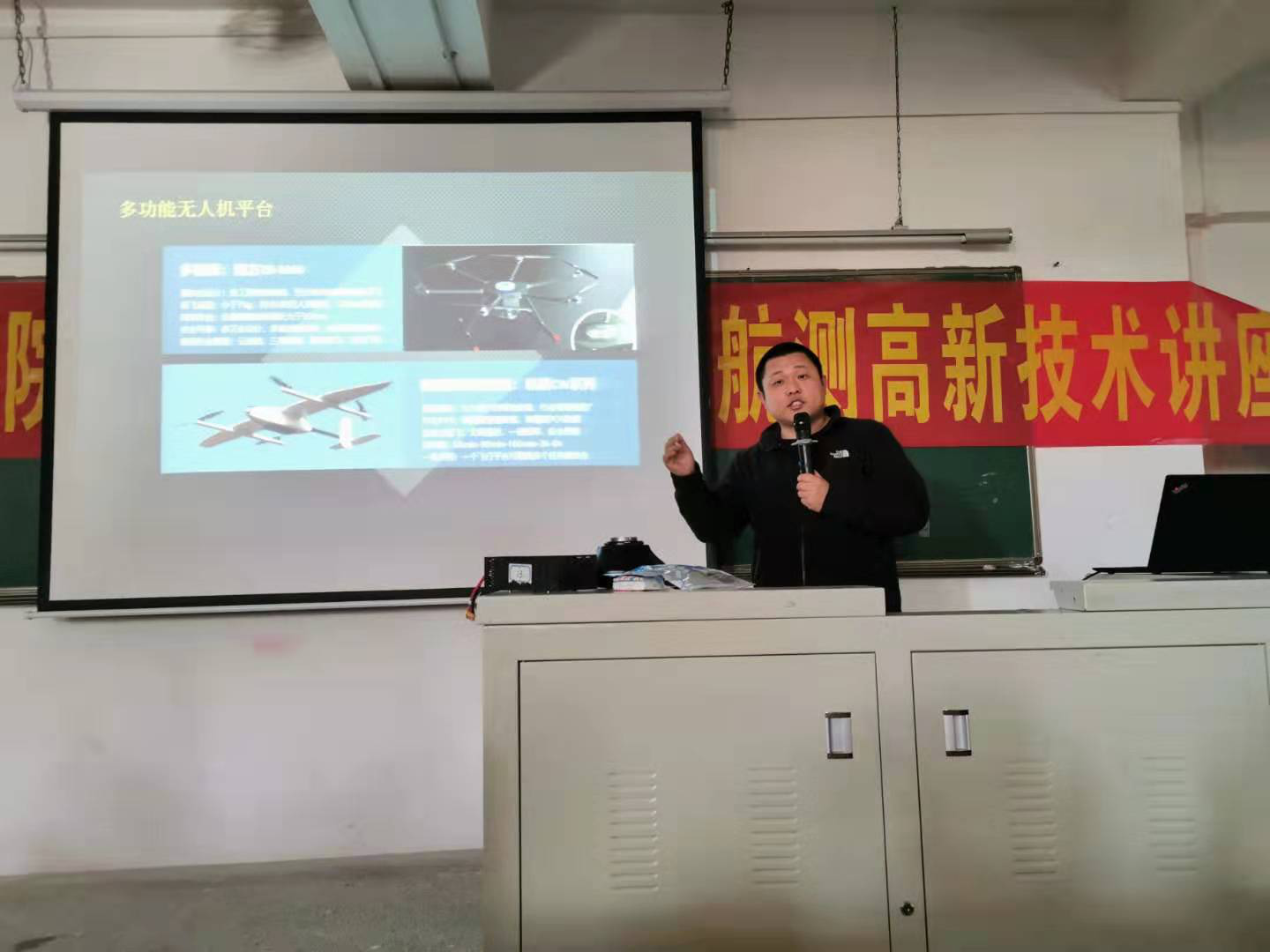 讲座上,王经理以航测从愿景到规模化应用为主题,从无人机低空遥感发展、典型航测无人机和任务荷载、航测数据处理、航测与传统测绘对比和航测数据应用等五个方面深入浅出地讲解了无人机航测技术应用,他还展示了南方测绘自主研发的全新高性能碳纤多轴飞行平台—ZR-M66无人机,为师生讲解ZR-M66无人机的飞行原理和应用。