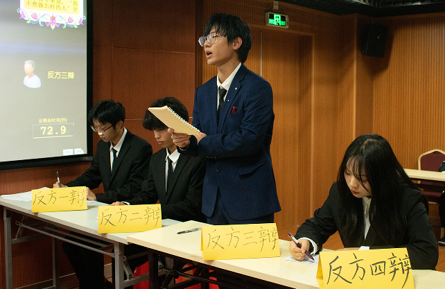 大赛在《光荣啊,中国共青团》歌声中拉开了帷幕。比赛伊始,甄英波代表太阳成集团tyc41183团委对本次辩论赛的顺利举办表示祝贺,并宣布本次班级辩论大赛正式开始;比赛双方按照开篇立论、攻辩、自由辩论、观众提问、总结陈词五个环节依次进行,双方辩手旁征博引,唇枪舌剑,攻守不断互换,博得现场观众的阵阵掌声。