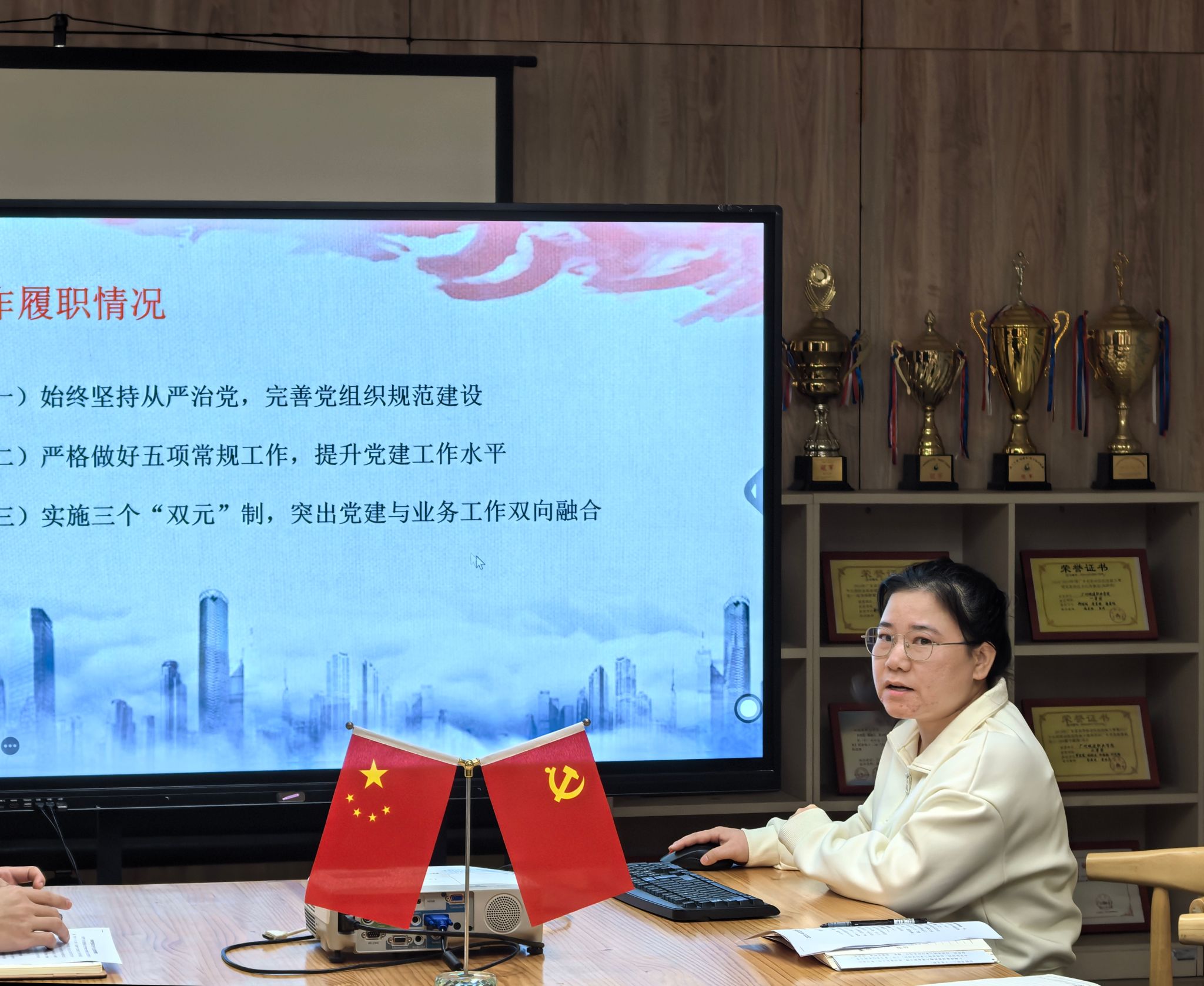 在述职评议会环节中,七位党支部书记从主要工作、存在问题以及认识体会和下一步思路举措等方面开展述职。现场采取“一述一评”的方式点评各支部书记的述职情况,并由与会人员对各党支部书记进行提问和评议。吴承霞在总结讲话中对各党支部书记在过去一年里都能围绕公司“双高”建设和公司中心工作开展工作,实现了以党建带业务、以业务促党建的良性双循环表示充分肯定。同时,她强调各党支部书记要针对述职评议考核中指出的问题,列出整改清单,认真抓好整改落实,进一步提升党支部党建工作的科学性和有效性。最后,吴承霞勉励各党支部书记要继续强化党建引领,总结凝练党建特色,突出党建提质增效,推动公司高质量发展。