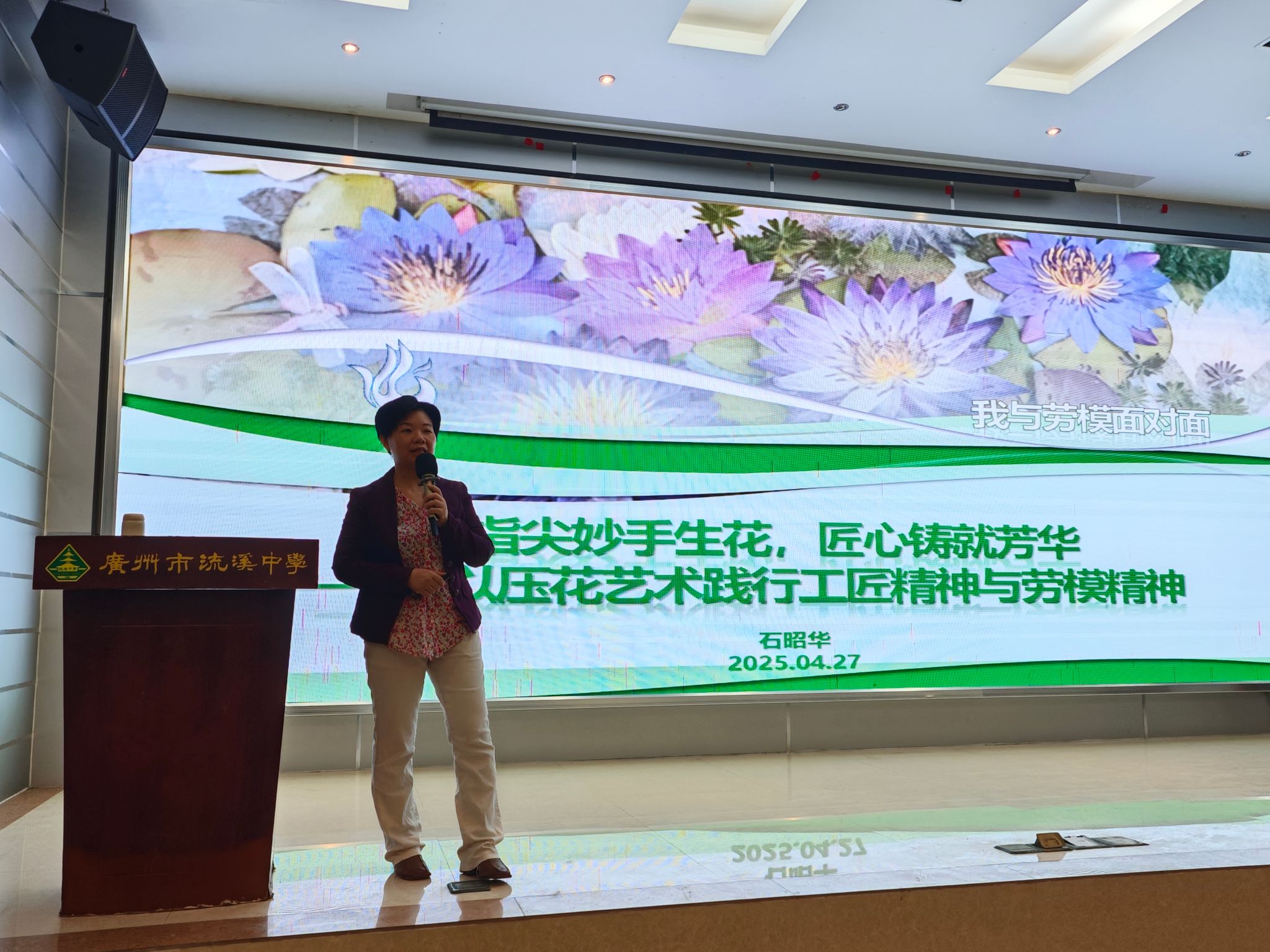 上午,在流溪中学报告厅里,一场别开生面的压花交流讲座在掌声中拉开了帷幕。本次活动是流溪中学“我与劳模面对面”主题活动的一部分。石昭华老师应邀前往,并以“指尖妙手生花,匠心铸就芳华——以压花艺术践行工匠精神与劳模精神”为题,向流溪中学的学子们真实地诠释了工匠精神与劳模精神。随后,流中学子在石老师及助教师生的指导下,完成了一张张精美的压花书签,以自身的体验,来感受精益求精的工匠精神,切身体验其内涵。