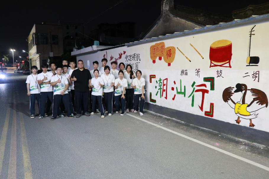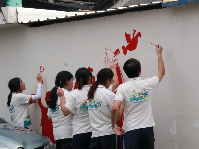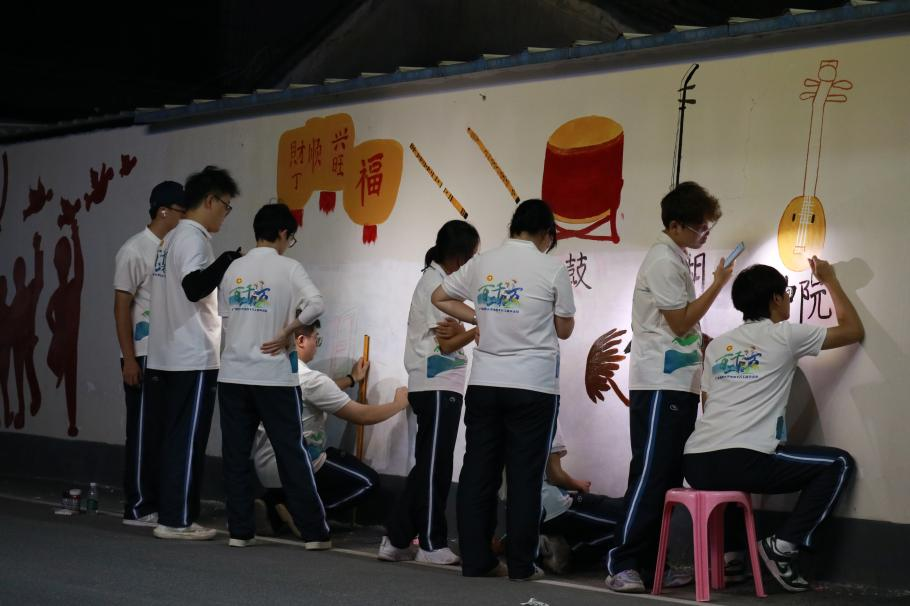 7月8日,实践团成员化身“文化使者”,在井都镇社区墙面挥毫创作。通过前期实地考察和综合考量确定绘画位置后,队员们拿起颜料桶、画笔,在社区墙面勾勒出一幅幅生动图景:红色革命剪影画唤醒历史记忆,笛套音乐乐器图案流淌古韵遗风,憨态可掬的狮头鹅尽显乡土灵趣,“潮汕行”字样与小桃红歌曲进度条的创意组合,更让墙面跃动着青春气息。烈日下,队员们汗湿衣衫却干劲十足。这面墙已不仅是艺术作品,更成为传播潮汕文化的“露天展厅”,让村民在日常驻足间便能感受文化魅力,让乡土文化以更鲜活的方式融入生活。