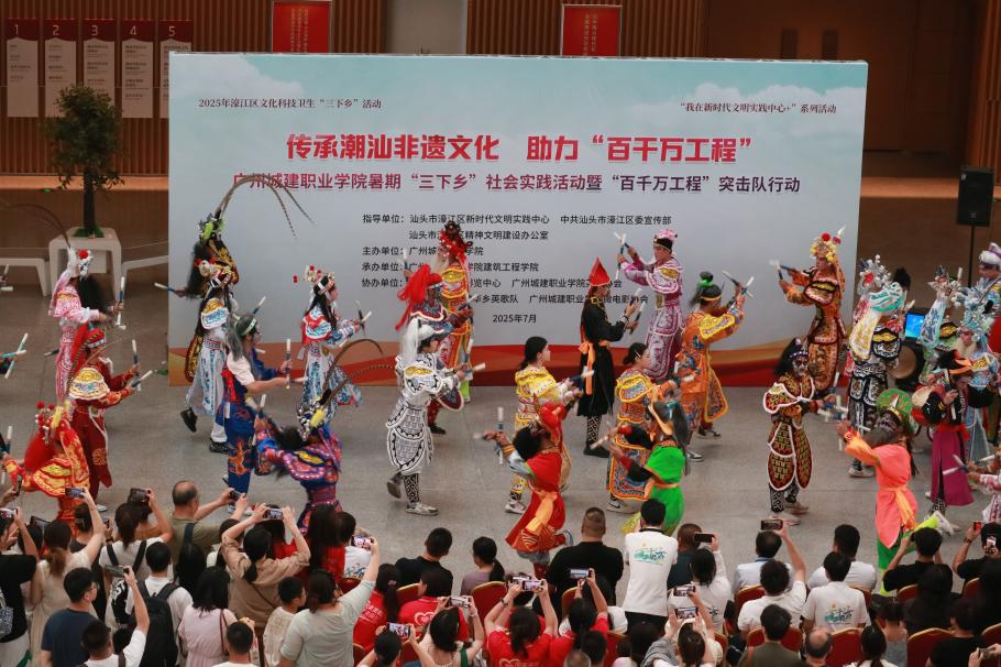 7月9日下午,汕头市潮汕历史文化博览中心内人潮涌动,掌声、欢呼声此起彼伏。太阳成集团tyc41183“党建领航,非遗‘破圈’文化赋能乡村振兴”英歌舞展演在此隆重举行。舞台上,楼华乡英歌舞演员们默契配合,将英歌舞的豪迈与激情展现得淋漓尽致。刚劲有力的动作、整齐划一的步伐、激昂澎湃的锣鼓声,赢得了现场观众的阵阵掌声和喝彩声。展演结束后,实践团同学和部分观众上台,在英歌队队员的指导下,学习简单的英歌动作和步伐。大家热情高涨,认真学习每一个动作,亲身触摸这千年传承的艺术。《学习强国》、南方+、《汕头新闻》等各大媒体争相报道。此次展演不仅是一次非遗文化的精彩呈现,更是“潮启新程”社会实践服务团在乡村振兴道路上的一次成功实践。通过英歌舞这一载体,团队将党建引领与非遗传承有机结合,为乡村文化振兴贡献了青春力量。
