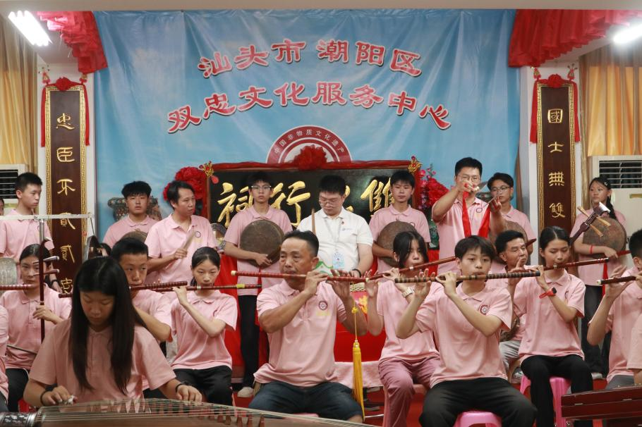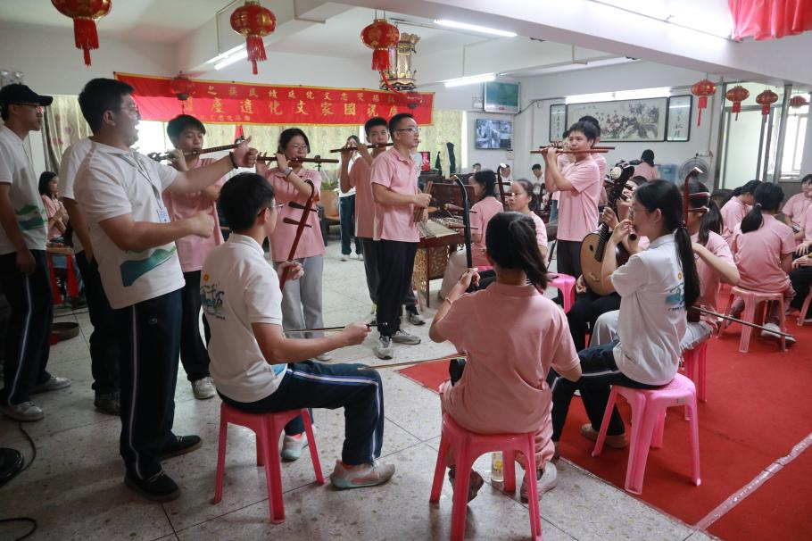 同日下午,实践团前往濠江区文光街道双忠文化传承基地,开启非遗溯源之旅。沉浸式观看笛套音乐表演。古朴的旋律从二弦、琵琶、月琴中流淌而出,队员们屏息聆听,用心感受着这一非遗文化的独特魅力,用镜头记录下每一个精彩瞬间,“原来这就是被列入国家级非遗的音乐,比课本里描述的更动人!”一位队员的感叹道出大家心声。这场研学让队员们深刻体悟到,传统技艺中蕴藏的不仅是潮汕先民的智慧,更是乡村振兴的文化底气。
