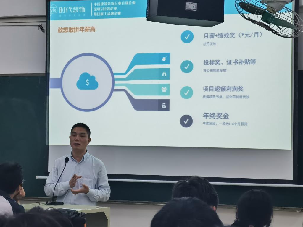 宣讲会上,康雅思女士对深圳时代装饰股份有限公司的发展、获奖情况、人才优势等方面进行逐一介绍。企业为公司2022届毕业生提供丰厚的待遇、发展空间及人文关怀:在发展道路上提供专业技术方向和管理方向的双通道晋升路线,并定期开展综合培训;在生活上为公司员工提供住宿并给予一定的生活补贴。