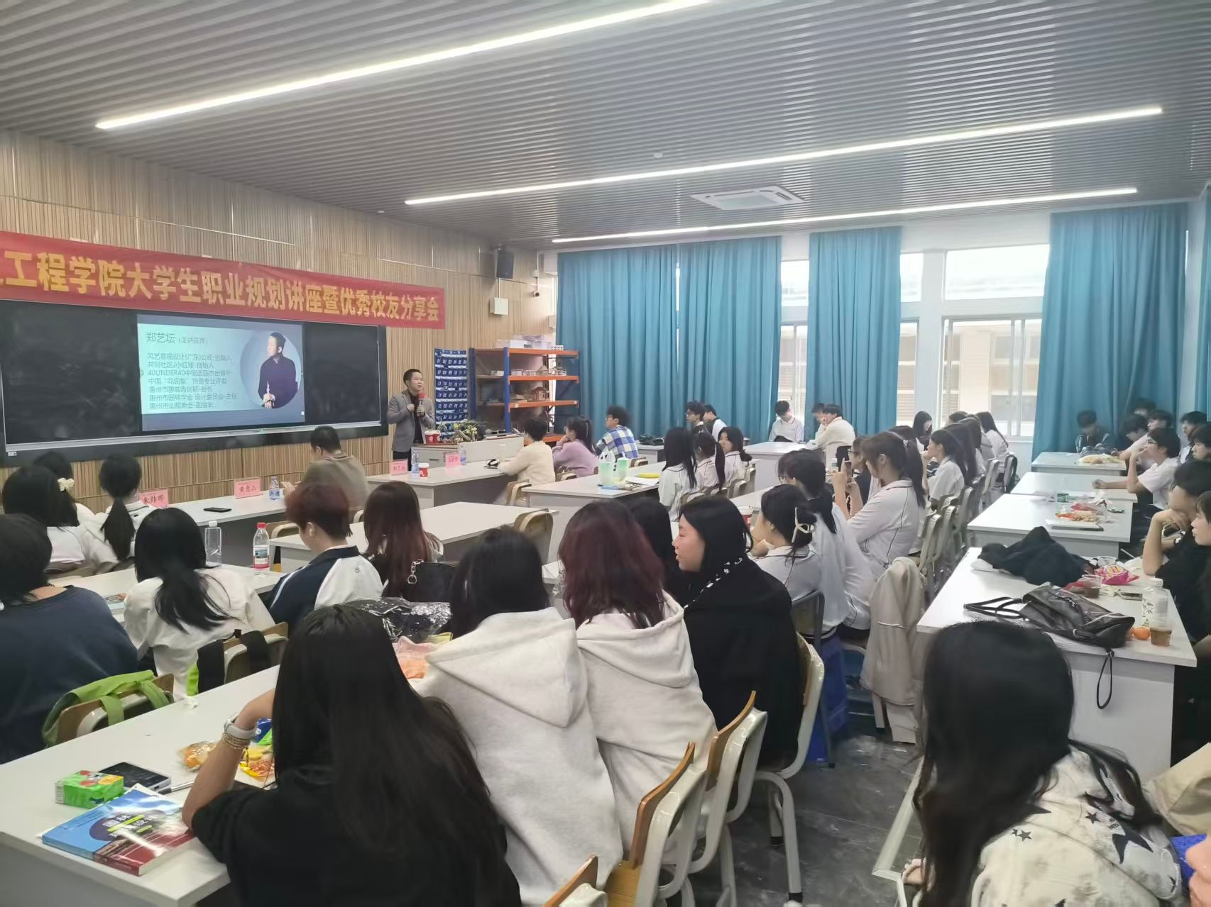 为使公司在校员工更深入地了解专业发展前景,激发其学习主动性与职业规划意识,促进在校期间的自我成长与方向明确,11月13日下午3:00,建筑工公司于建工机电楼B栋204B课室举办优秀员工分享会。2006级优秀毕业生、风艺景观设计(广东)公司创始人、共邻社区、小红楼创始人郑艺坛,2008级邹彩玲,2012级黄惠山等三名员工回校交流,2023、2024级园林专业全体同学参加本次分享会。活动由建筑设计教研室石昭华老师主持。