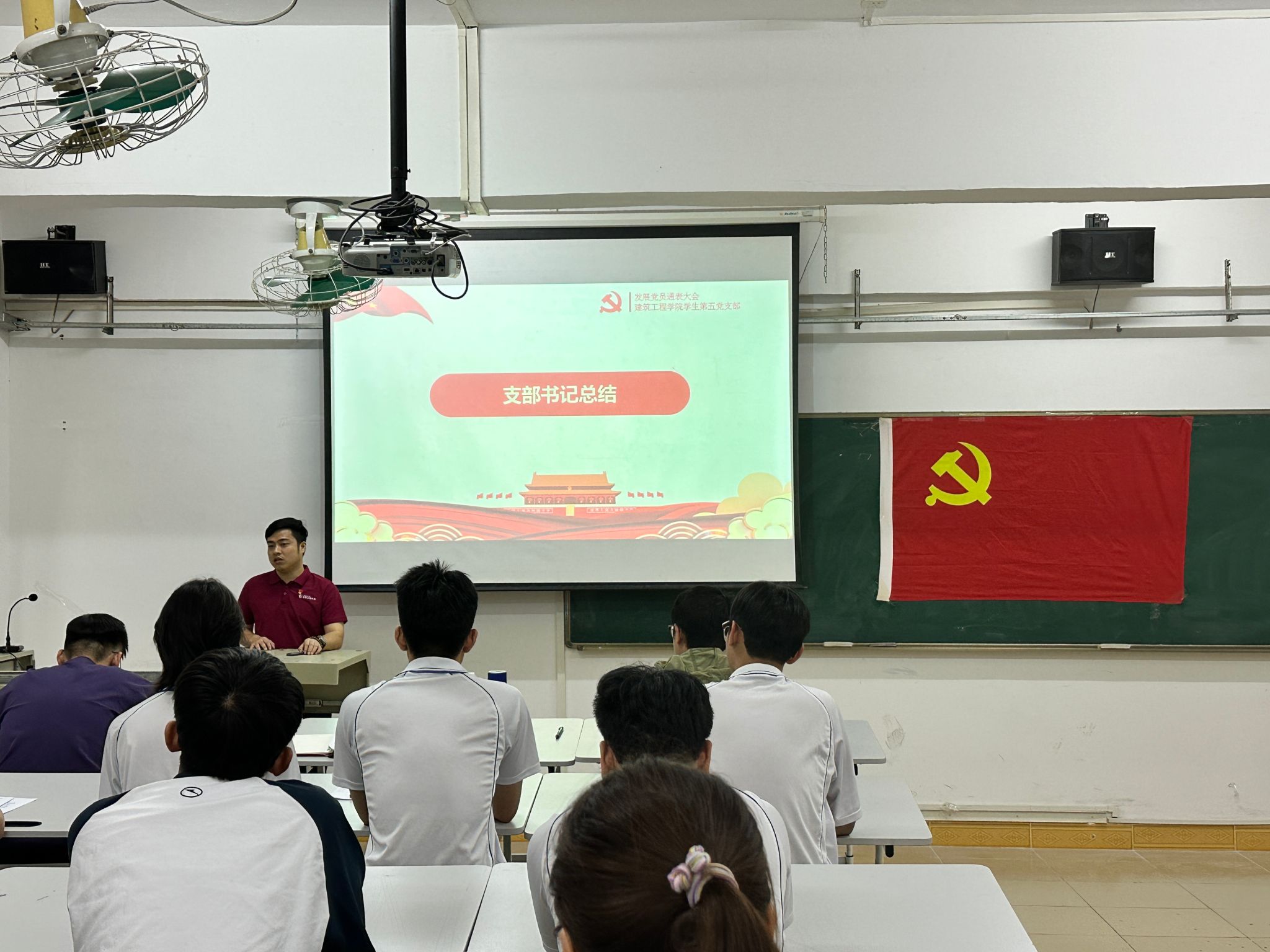 大会在庄严的国歌声中拉开序幕。方晓东书记带领全体人员学习习近平总书记在广东考察的重要讲话精神,他号召全体师生党员要深刻领会精神内核,把讲话要求转化为支部建设和育人实践的具体行动。随后,24名发展对象依次上台结合思想成长、学业表现、工作实践等方面,详细汇报了培养考察期间的感悟与收获,明确了今后的努力方向,坚定表达了追随党的信念与入党决心。在听取发展对象汇报后,与会正式党员充分酝酿,结合每位发展对象的综合表现充分讨论,逐一发表意见并进行无记名投票表决。