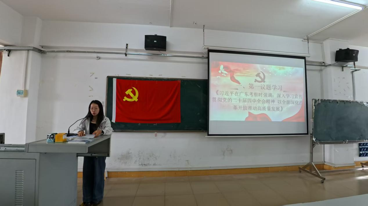 大会伊始,党支部组织委员莫雪艳同志带领大家深入学习“第一议题”关于《习近平在广东考察时强调:深入学习宣传贯彻党的二十届四中全会精神,以全面深化改革开放推动高质量发展》的重要论述。她指出,认真学习贯彻党的二十届四中全会精神是当前及今后一段时期内的重要政治任务,全体入党积极分子要通过多层次、多渠道的学习方式,深刻领悟会议精神,凝聚共识,增强信心。莫雪艳同志强调,广东作为经济大省和改革开放前沿,“十五五”规划时应树立高站位、大格局,展现走在前列、示范和担当的责任。随后,黄润煜同学分享学习心得,发言情真意切,展现了青年学子的深刻思考与积极态度。