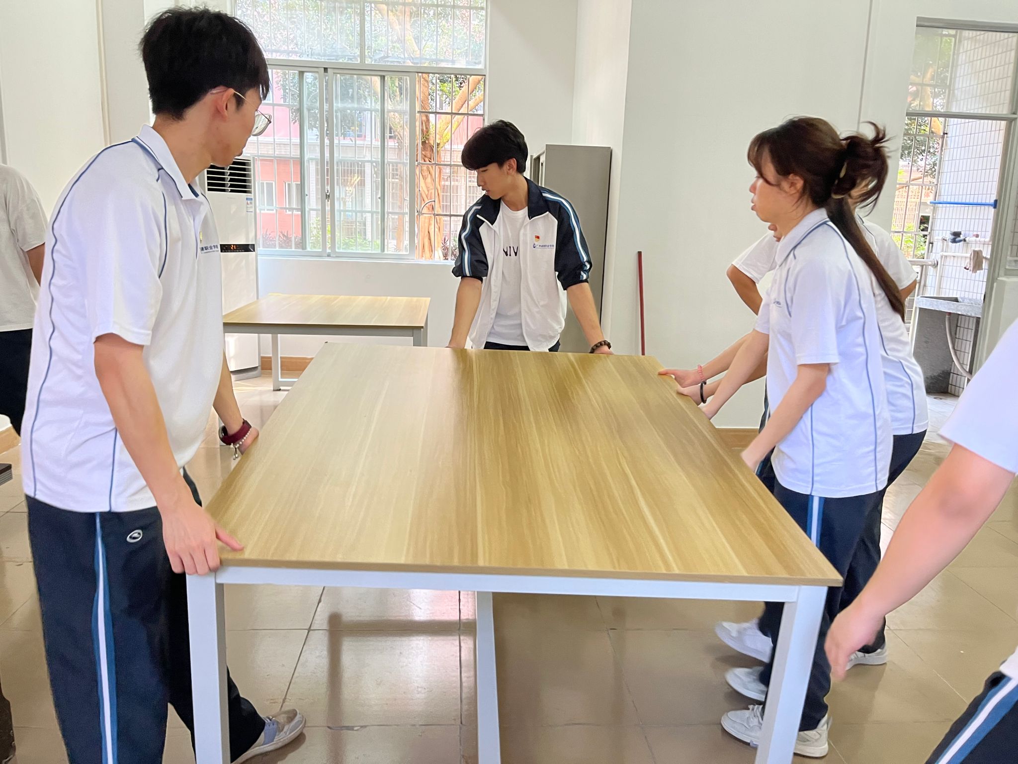 员工党员搬运桌子