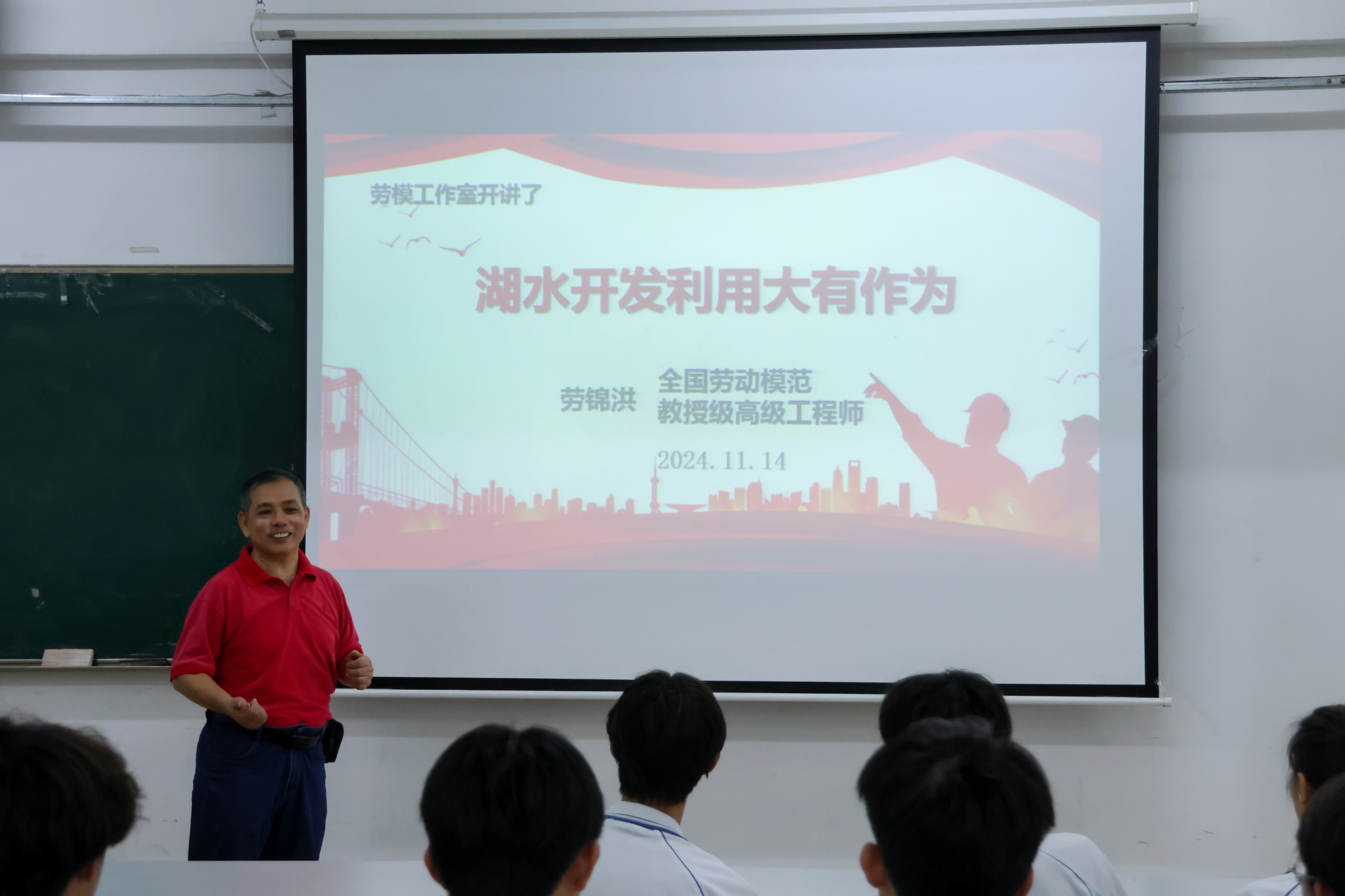 本次讲座围绕《校园节水建设大有作为》和《湖水开发利用大有作为》两个主题展开。劳锦洪教授深入浅出地介绍了公司在深入践行习近平生态文明思想,在助力美丽中国建设中贡献智慧和力量以及节水技术国家发明专利研发和转化应用到校园的显著成效。他分享了师生参与生态保护、节水减排等科研与公益活动的生动案例,与团队制作的《湖水开发与利用》科普视频等成果,让师生们更加直观地了解了湖水开发与利用的重要性和可行性。他鼓励师生们积极投身于科研项目,深入研究和开发具有创新性、实用性的技术和产品,为绿色校园做贡献。